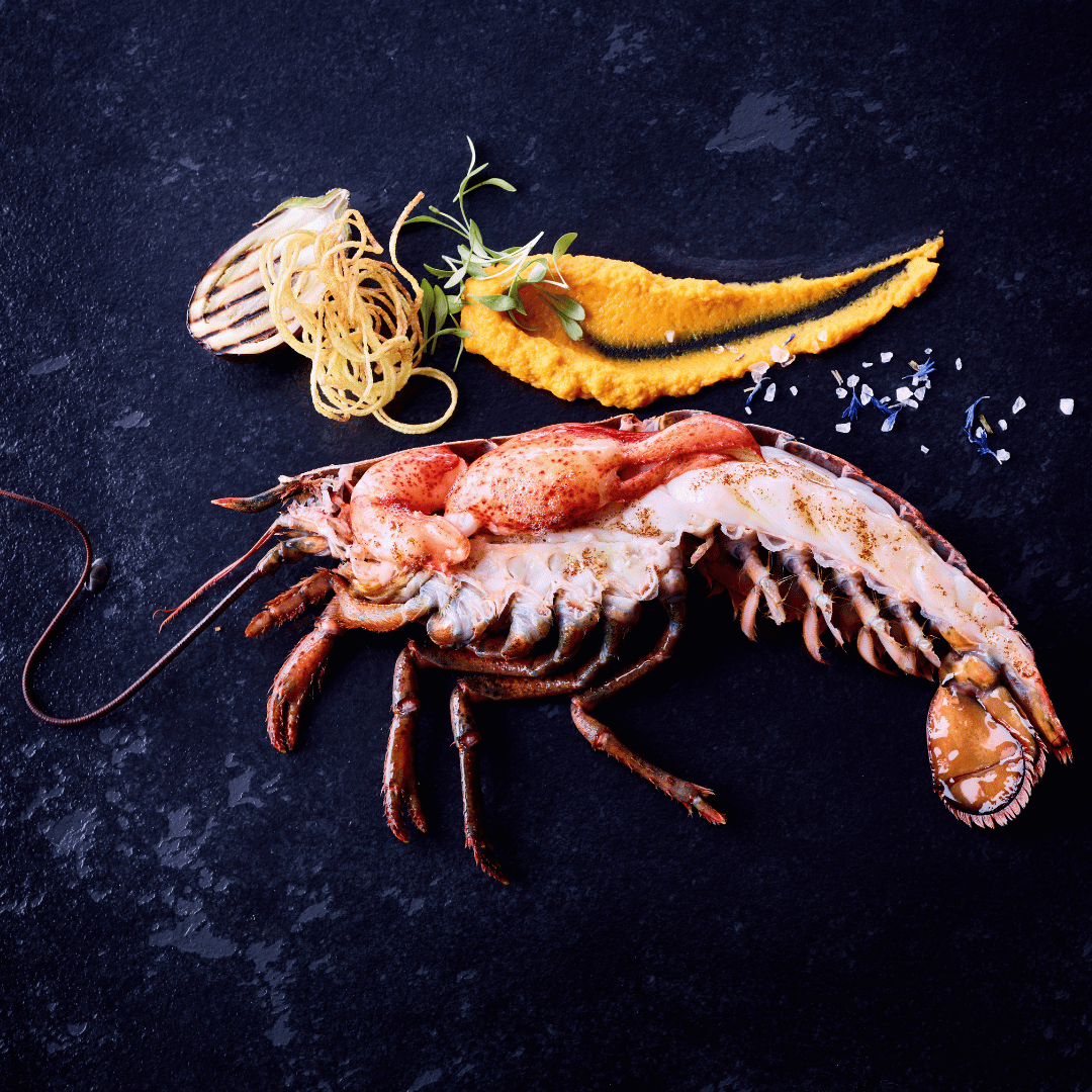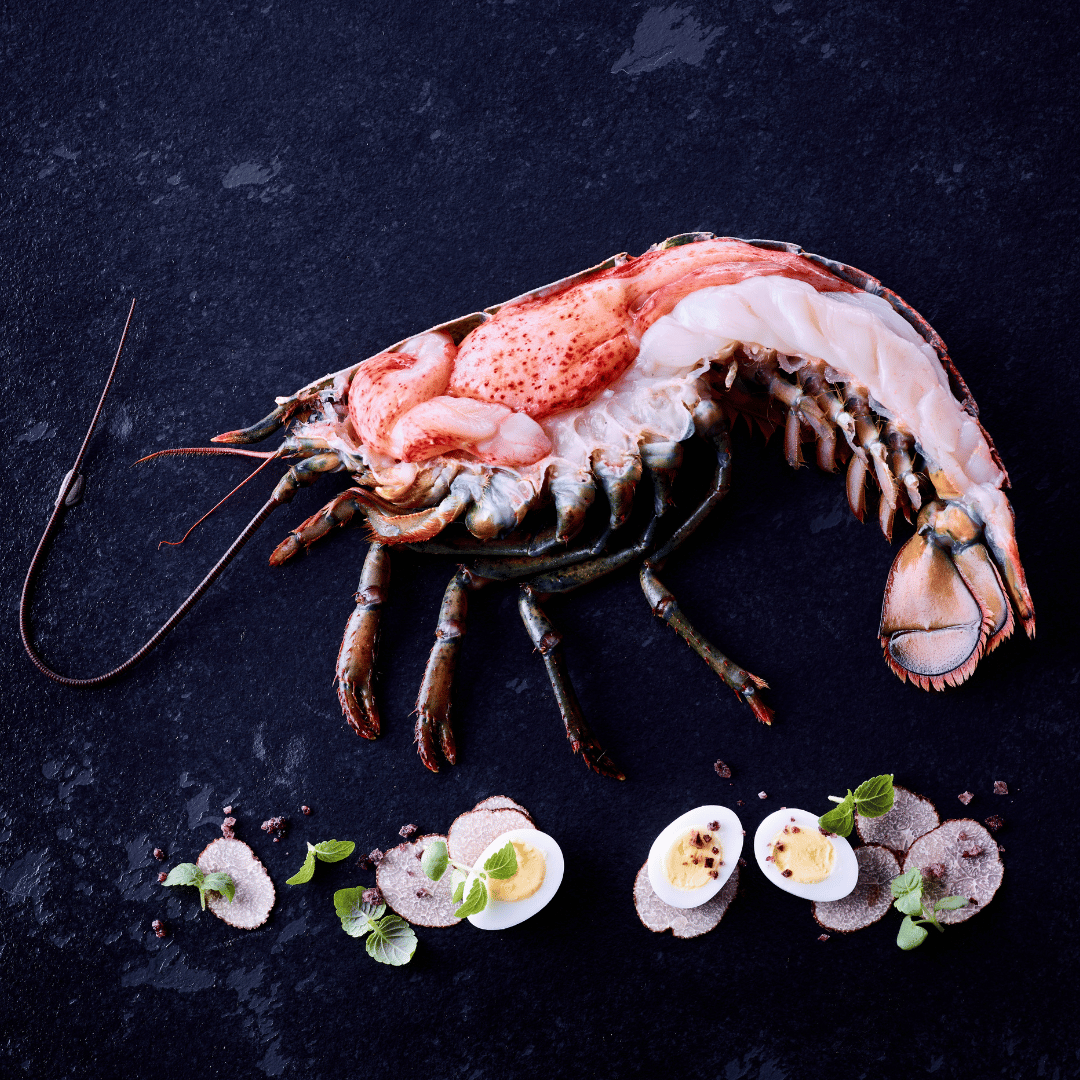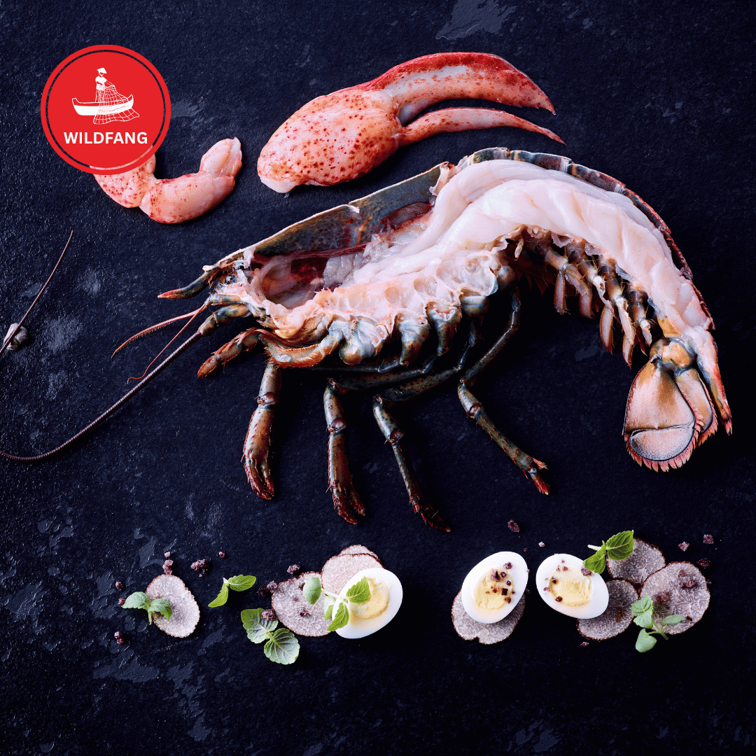Halber Hummerschwanz mit Scheren- und Gelenkfleisch in der Schale. Festes, saftiges Fleisch vom Atlantischen Hummer, das durch das schonende Hochdruckverfahren (HPP) besonders zart wird und angenehm auf der Zunge zergeht.